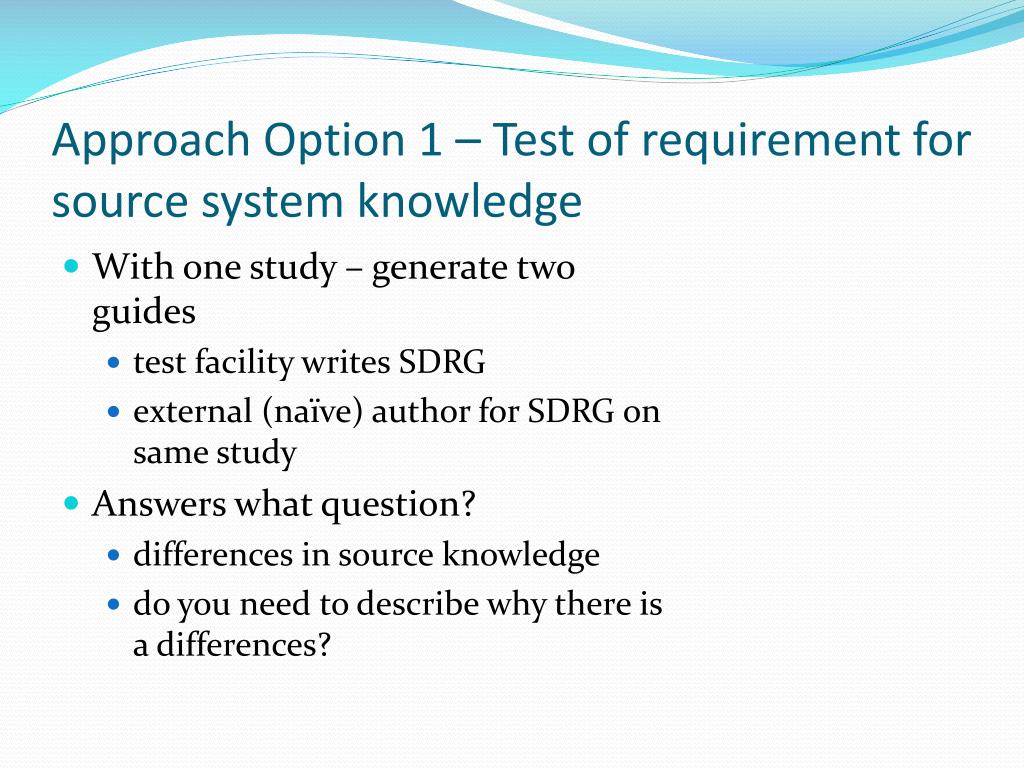 Approach Option 1 – Test of requirement for source system knowledge • With one study – generate two guides • test facility writes SDRG • external (naïve) author for SDRG on same study • Answers what question? • differences in source knowledge • do you need to describe why there is a differences?