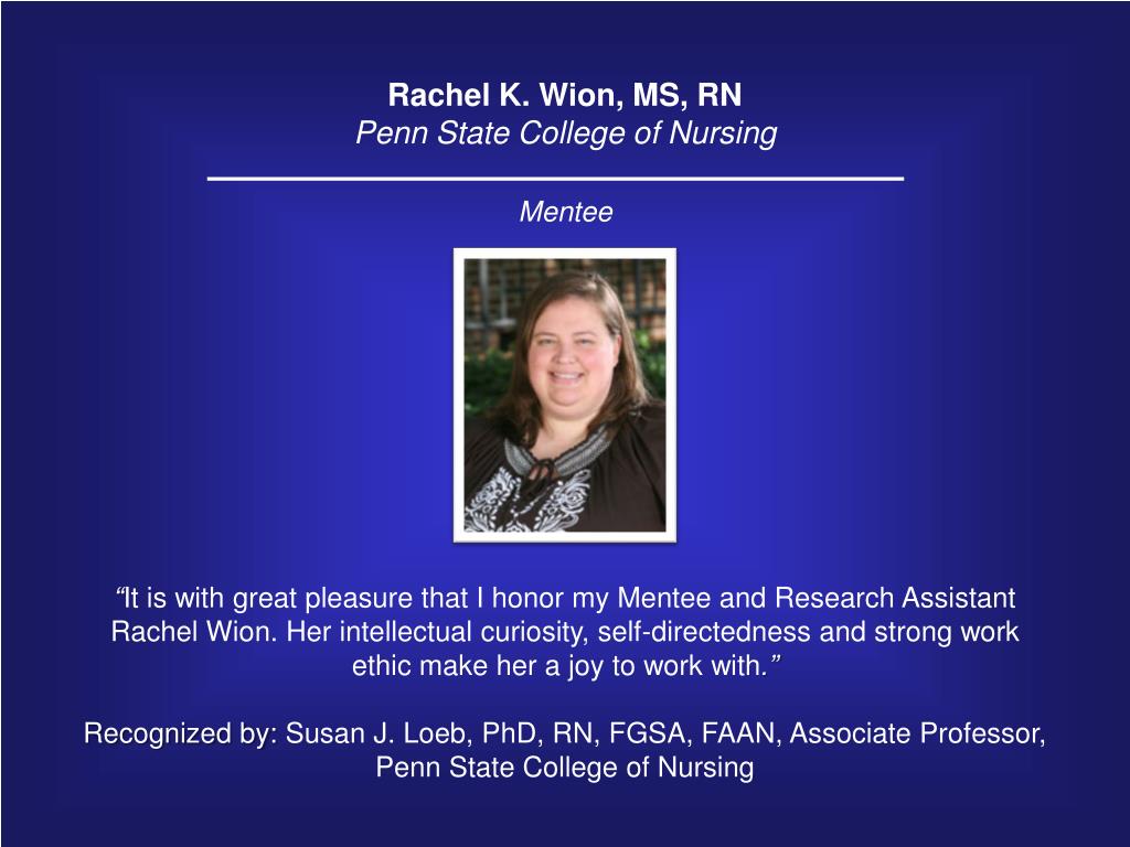 Rachel K. Wion, MS, RN Penn State College of Nursing Mentee “It is with great pleasure that I honor my Mentee and Research Assistant Rachel Wion. Her intellectual curiosity, self-directedness and strong work ethic make her a joy to work with.” Recognized by: Susan J. Loeb, PhD, RN, FGSA, FAAN, Associate Professor, Penn State College of Nursing