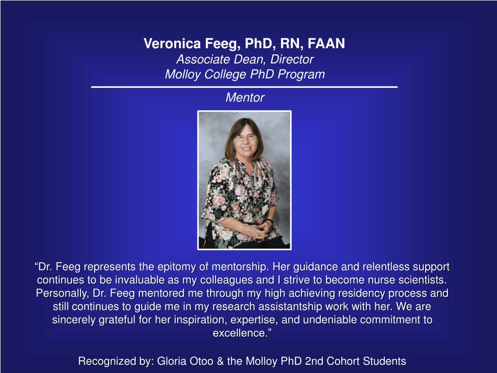 Veronica Feeg, PhD, RN, FAAN Associate Dean, Director Molloy College PhD Program Mentor “Dr. Feeg represents the epitomy of mentorship. Her guidance and relentless support continues to be invaluable as my colleagues and I strive to become nurse scientists. Personally, Dr. Feeg mentored me through my high achieving residency process and still continues to guide me in my research assistantship work with her. We are sincerely grateful for her inspiration, expertise, and undeniable commitment to excellence.” Recognized by: Gloria Otoo & the Molloy PhD 2nd Cohort Students