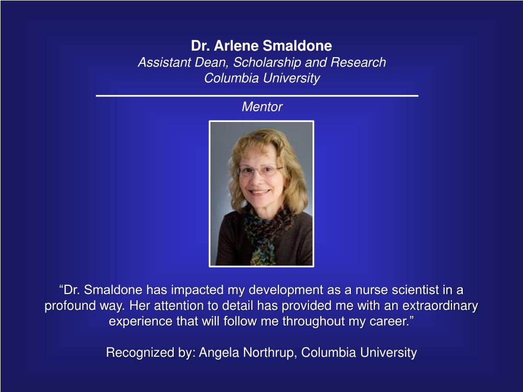 Dr. Arlene Smaldone Assistant Dean, Scholarship and Research Columbia University Mentor “Dr. Smaldone has impacted my development as a nurse scientist in a profound way. Her attention to detail has provided me with an extraordinary experience that will follow me throughout my career.” Recognized by: Angela Northrup, Columbia University