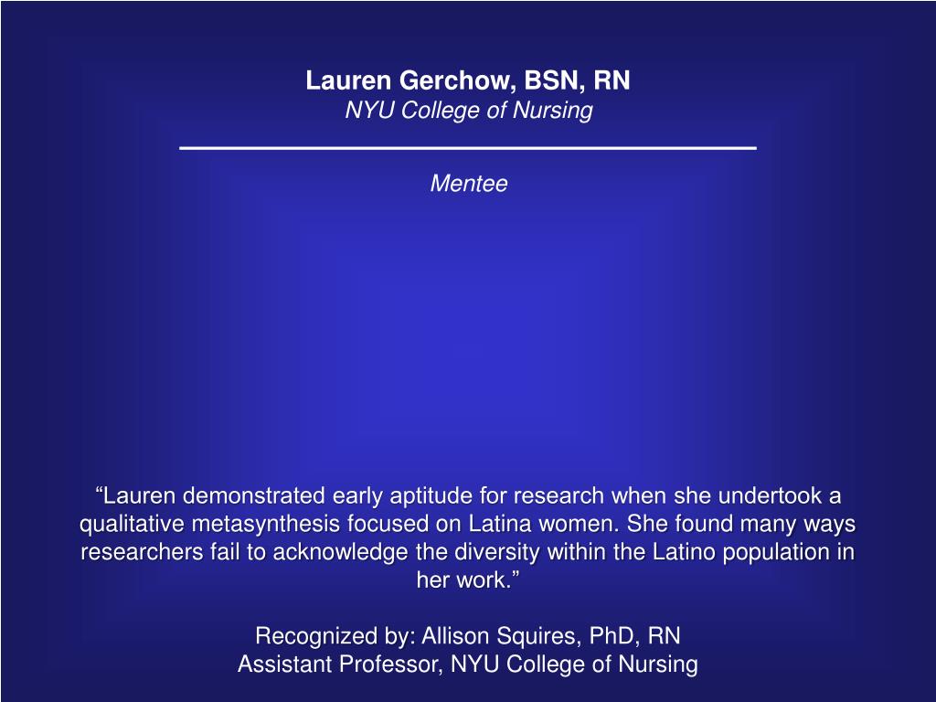 Lauren Gerchow, BSN, RN NYU College of Nursing Mentee “Lauren demonstrated early aptitude for research when she undertook a qualitative metasynthesis focused on Latina women. She found many ways researchers fail to acknowledge the diversity within the Latino population in her work.” Recognized by: Allison Squires, PhD, RN Assistant Professor, NYU College of Nursing