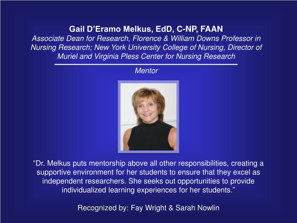 Gail D’Eramo Melkus, EdD, C-NP, FAAN Associate Dean for Research, Florence & William Downs Professor in Nursing Research; New York University College of Nursing, Director of Muriel and Virginia Pless Center for Nursing Research Mentor “Dr. Melkus puts mentorship above all other responsibilities, creating a supportive environment for her students to ensure that they excel as independent researchers. She seeks out opportunities to provide individualized learning experiences for her students.” Recognized by: Fay Wright & Sarah Nowlin