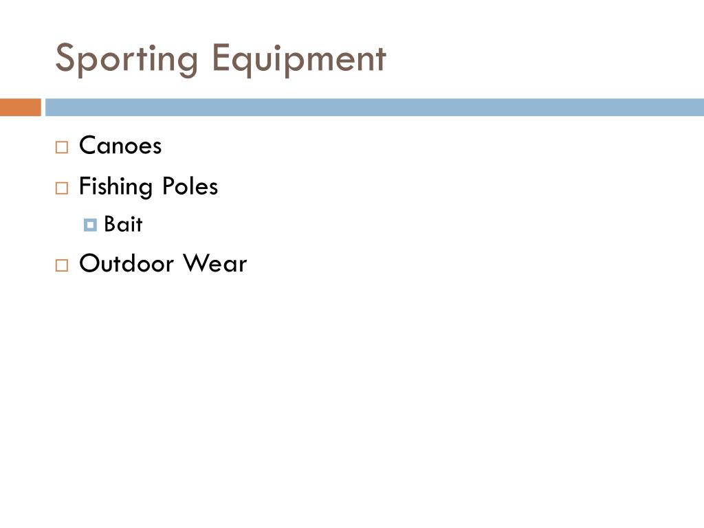 Sporting Equipment • Canoes • Fishing Poles • Bait • Outdoor Wear