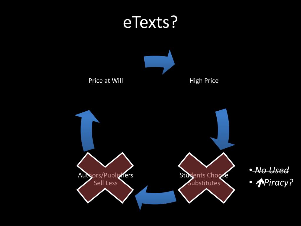 eTexts…why so much? Amazon Rental $85.35 Used (if avail) $136.80 New $171.00 Etextbook $119.10 75% of List 70% of List Rental $101.10 Used (if avail) $162.10 New $202.65 Etextbook $154.85 77% of List • Common Restrictions • Limited access • Limited devices • Limited printing Rental $96.10 Used (if avail) $154.05 New $192.55 Etextbook $134.10 70% of List