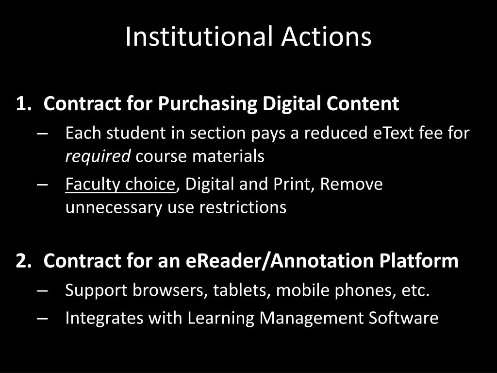 Institutional Actions • Contract for Purchasing Digital Content • Each student in section pays a reduced eText fee for required course materials • Faculty choice, Digital and Print, Remove unnecessary use restrictions • Contract for an eReader/Annotation Platform • Support browsers, tablets, mobile phones, etc. • Integrates with Learning Management Software