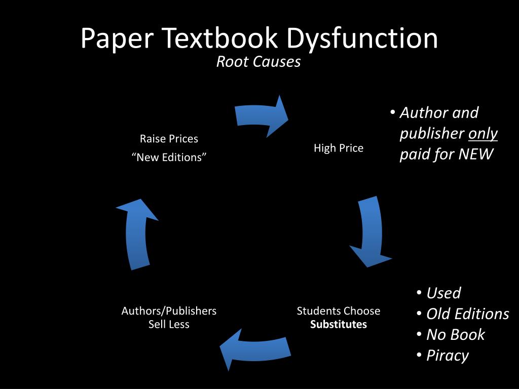 Paper Textbook Dysfunction Root Causes • Author and publisher onlypaid for NEW • Used • Old Editions • No Book • Piracy