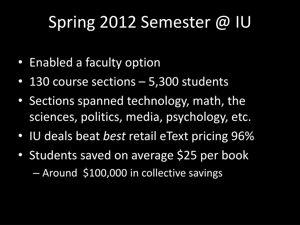 Spring 2012 Semester @ IU • Enabled a faculty option • 130 course sections – 5,300 students • Sections spanned technology, math, the sciences, politics, media, psychology, etc. • IU deals beat best retail eText pricing 96% • Students saved on average $25 per book • Around $100,000 in collective savings