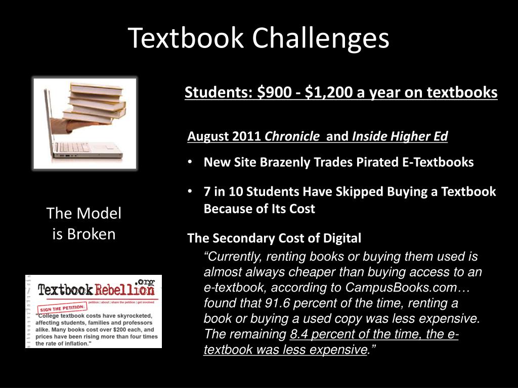 Textbook Challenges Students: $900 - $1,200 a year on textbooks • August 2011 Chronicle and Inside Higher Ed • New Site Brazenly Trades Pirated E-Textbooks • 7 in 10 Students Have Skipped Buying a Textbook Because of Its Cost • The Secondary Cost of Digital The Model is Broken • “Currently, renting books or buying them used is almost always cheaper than buying access to an e-textbook, according to CampusBooks.com… found that 91.6 percent of the time, renting a book or buying a used copy was less expensive. The remaining 8.4 percent of the time, the e-textbook was less expensive.”