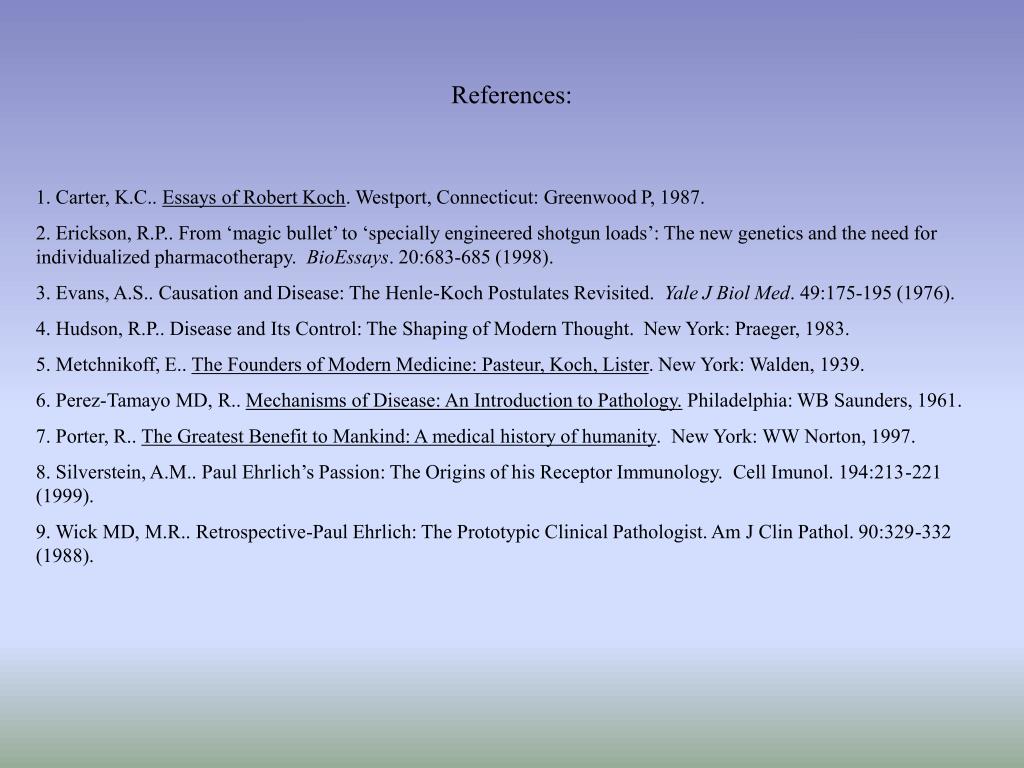 References: 1. Carter, K.C.. Essays of Robert Koch. Westport, Connecticut: Greenwood P, 1987. 2. Erickson, R.P.. From ‘magic bullet’ to ‘specially engineered shotgun loads’: The new genetics and the need for individualized pharmacotherapy. BioEssays. 20:683-685 (1998). 3. Evans, A.S.. Causation and Disease: The Henle-Koch Postulates Revisited. Yale J Biol Med. 49:175-195 (1976). 4. Hudson, R.P.. Disease and Its Control: The Shaping of Modern Thought. New York: Praeger, 1983. 5. Metchnikoff, E.. The Founders of Modern Medicine: Pasteur, Koch, Lister. New York: Walden, 1939. 6. Perez-Tamayo MD, R.. Mechanisms of Disease: An Introduction to Pathology. Philadelphia: WB Saunders, 1961. 7. Porter, R.. The Greatest Benefit to Mankind: A medical history of humanity. New York: WW Norton, 1997. 8. Silverstein, A.M.. Paul Ehrlich’s Passion: The Origins of his Receptor Immunology. Cell Imunol. 194:213-221 (1999). 9. Wick MD, M.R.. Retrospective-Paul Ehrlich: The Prototypic Clinical Pathologist. Am J Clin Pathol. 90:329-332 (1988).