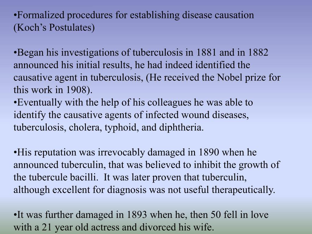 Formalized procedures for establishing disease causation (Koch’s Postulates) • Began his investigations of tuberculosis in 1881 and in 1882 announced his initial results, he had indeed identified the causative agent in tuberculosis, (He received the Nobel prize for this work in 1908). • Eventually with the help of his colleagues he was able to identify the causative agents of infected wound diseases, tuberculosis, cholera, typhoid, and diphtheria. • His reputation was irrevocably damaged in 1890 when he announced tuberculin, that was believed to inhibit the growth of the tubercule bacilli. It was later proven that tuberculin, although excellent for diagnosis was not useful therapeutically. • It was further damaged in 1893 when he, then 50 fell in love with a 21 year old actress and divorced his wife.