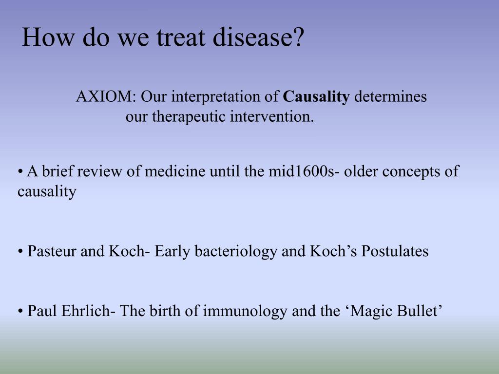 Koch’s Postulates and Ehrlich’s ‘Magic Bullet” :. Specific Causation, Treatment and Prevention- Doctrines of Specificity in Medicine. By: Elizabeth Griffiths, MS2. How do we treat disease?. AXIOM: Our interpretation of Causality determines our therapeutic intervention.