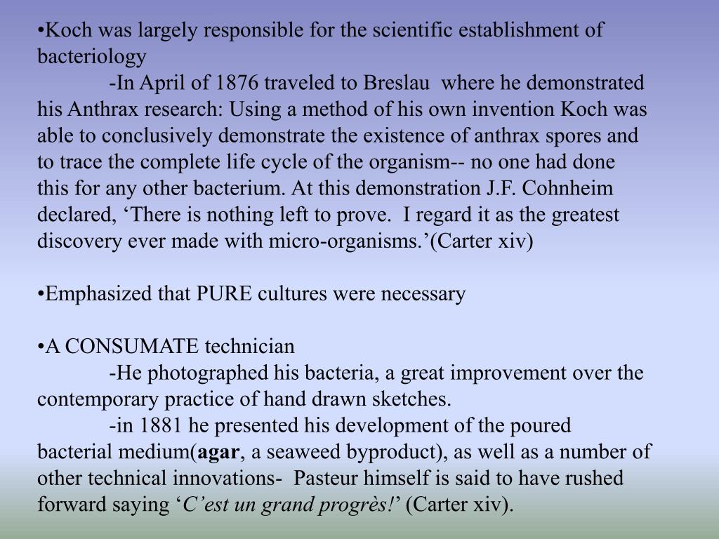 Koch was largely responsible for the scientific establishment of bacteriology • -In April of 1876 traveled to Breslau where he demonstrated his Anthrax research: Using a method of his own invention Koch was able to conclusively demonstrate the existence of anthrax spores and to trace the complete life cycle of the organism-- no one had done this for any other bacterium. At this demonstration J.F. Cohnheim declared, ‘There is nothing left to prove. I regard it as the greatest discovery ever made with micro-organisms.’(Carter xiv) • Emphasized that PURE cultures were necessary • A CONSUMATE technician • -He photographed his bacteria, a great improvement over the contemporary practice of hand drawn sketches. • -in 1881 he presented his development of the poured bacterial medium(agar, a seaweed byproduct), as well as a number of other technical innovations- Pasteur himself is said to have rushed forward saying ‘C’est un grand progrès!’ (Carter xiv).