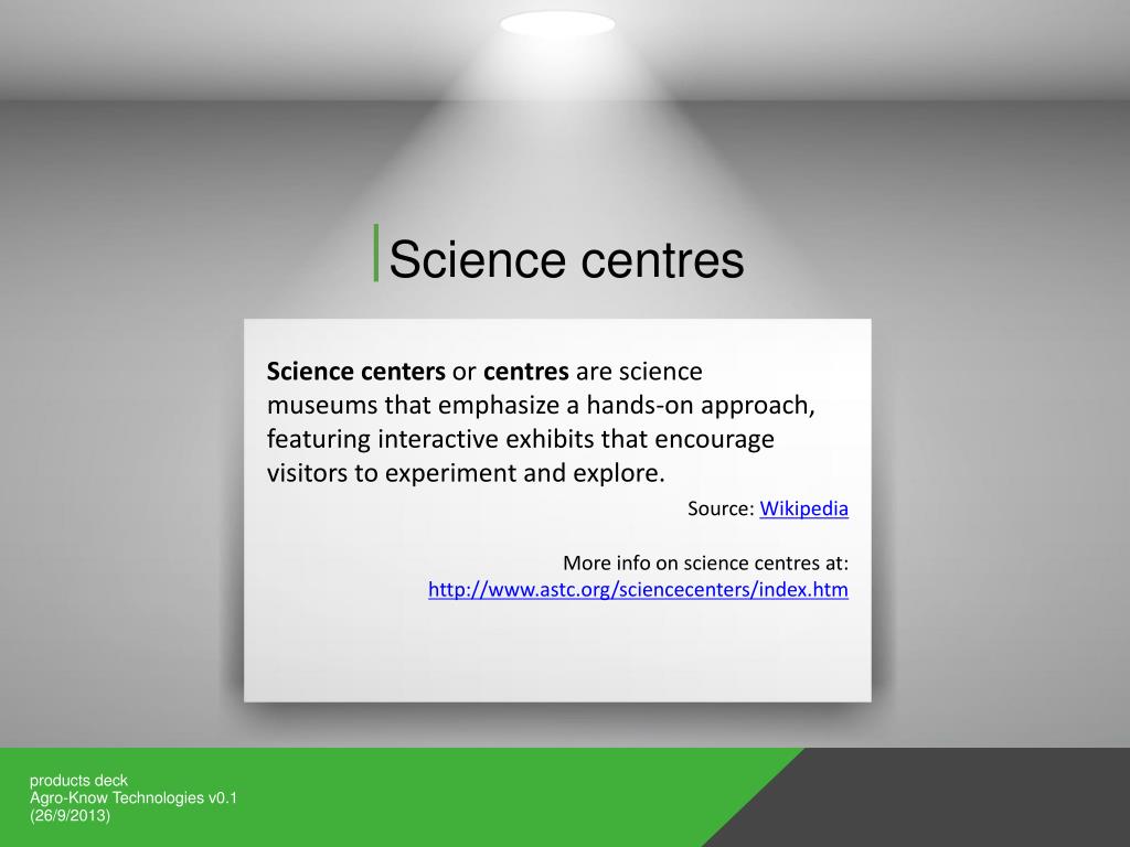 Science centres Science centers or centres are science museums that emphasize a hands-on approach, featuring interactive exhibits that encourage visitors to experiment and explore. Source: Wikipedia More info on science centres at: http://www.astc.org/sciencecenters/index.htm