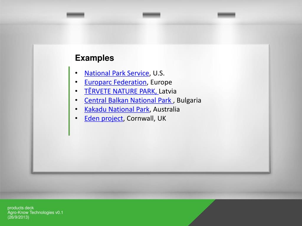 Examples • National Park Service, U.S. • Europarc Federation, Europe • TĒRVETE NATURE PARK, Latvia • Central Balkan National Park , Bulgaria • Kakadu National Park, Australia • Eden project, Cornwall, UK