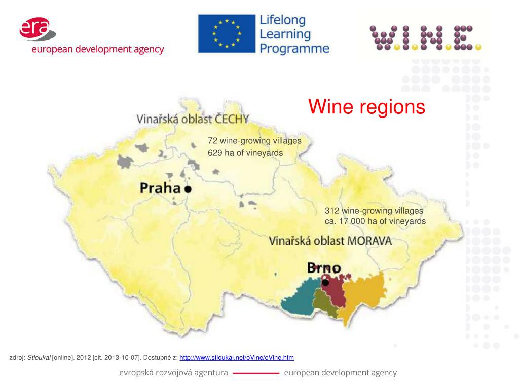 Wine regions 72 wine-growing villages 629 ha of vineyards 312 wine-growing villages ca. 17 000 ha of vineyards zdroj: Stloukal [online]. 2012 [cit. 2013-10-07]. Dostupné z: http://www.stloukal.net/oVine/oVine.htm