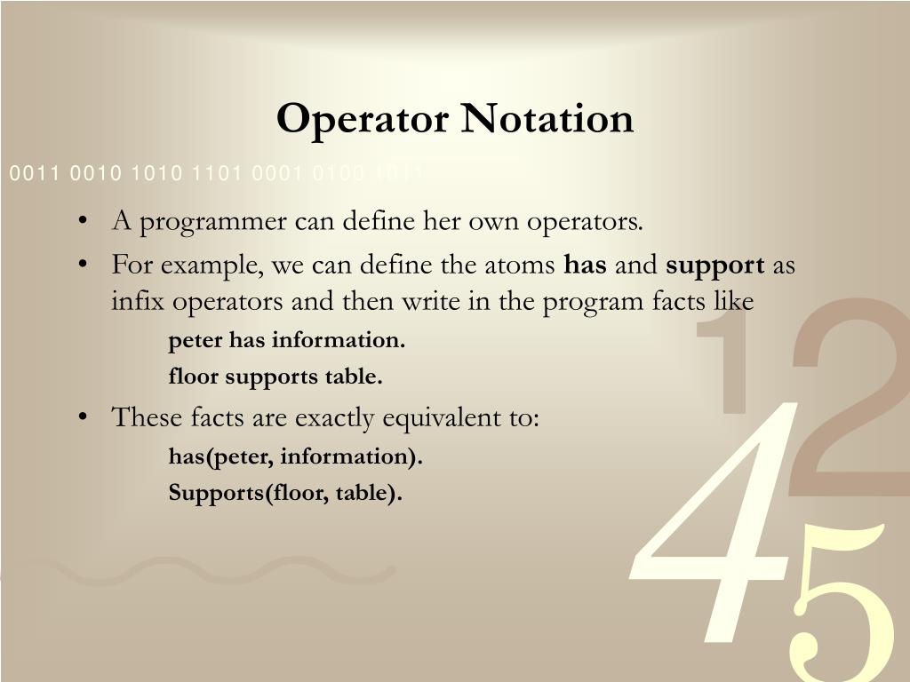 Operator Notation • A programmer can define her own operators. • For example, we can define the atoms has and support as infix operators and then write in the program facts like peter has information. floor supports table. • These facts are exactly equivalent to: has(peter, information). Supports(floor, table).