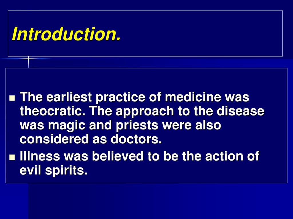 Introduction. • The earliest practice of medicine was theocratic. The approach to the disease was magic and priests were also considered as doctors. • Illness was believed to be the action of evil spirits.