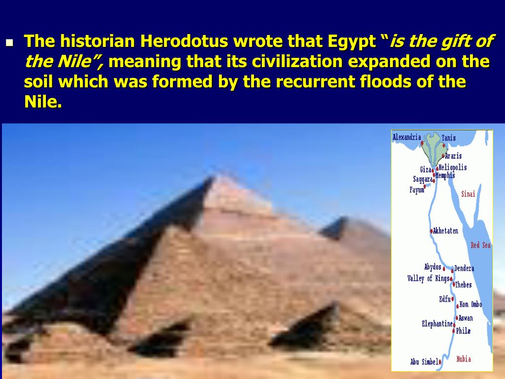 The historian Herodotus wrote that Egypt “is the gift of the Nile”, meaning that its civilization expanded on the soil which was formed by the recurrent floods of the Nile.