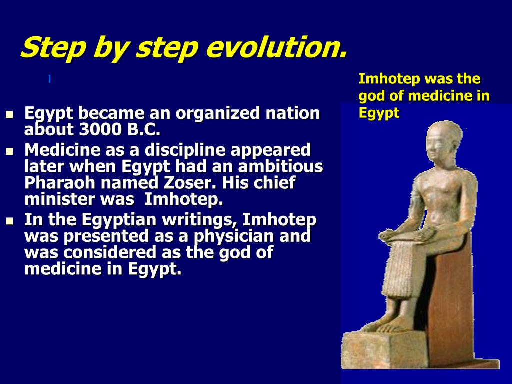 Step by step evolution. Imhotep was the god of medicine in Egypt • Egypt became an organized nation about 3000 B.C. • Medicine as a discipline appeared later when Egypt had an ambitious Pharaoh named Zoser. His chief minister was Imhotep. • In the Egyptian writings, Imhotep was presented as a physician and was considered as the god of medicine in Egypt.
