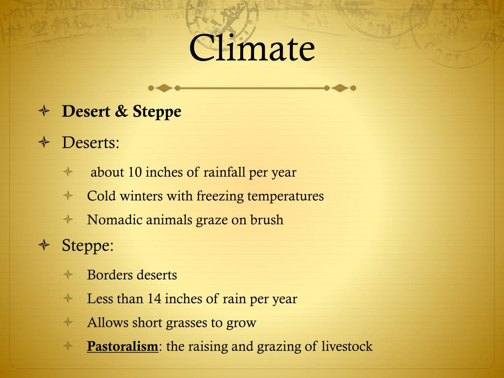 Climate • Desert & Steppe • Deserts: • about 10 inches of rainfall per year • Cold winters with freezing temperatures • Nomadic animals graze on brush • Steppe: • Borders deserts • Less than 14 inches of rain per year • Allows short grasses to grow • Pastoralism: the raising and grazing of livestock
