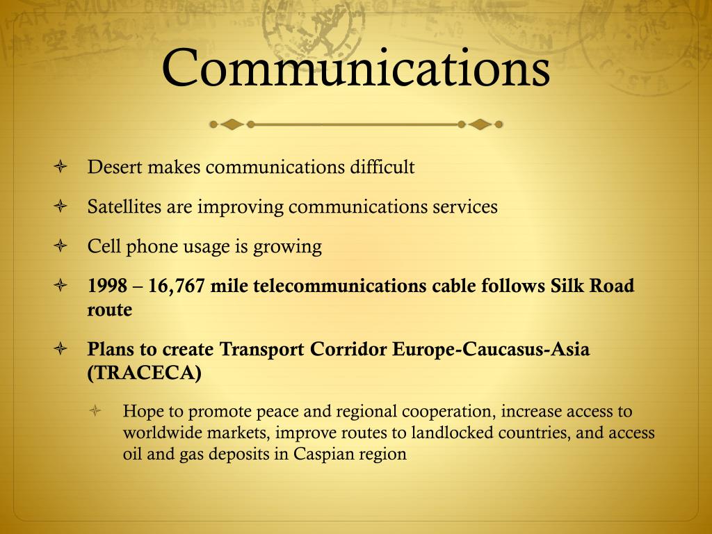 Communications • Desert makes communications difficult • Satellites are improving communications services • Cell phone usage is growing • 1998 – 16,767 mile telecommunications cable follows Silk Road route • Plans to create Transport Corridor Europe-Caucasus-Asia (TRACECA) • Hope to promote peace and regional cooperation, increase access to worldwide markets, improve routes to landlocked countries, and access oil and gas deposits in Caspian region