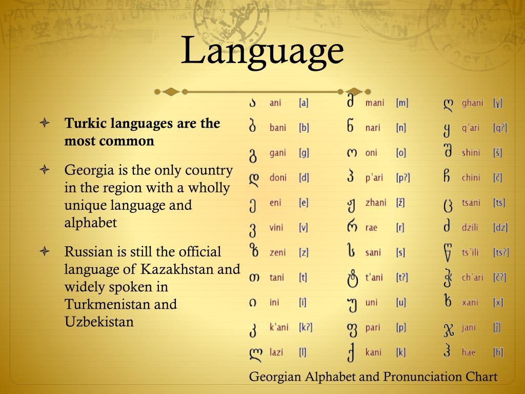 Language • Turkic languages are the most common • Georgia is the only country in the region with a wholly unique language and alphabet • Russian is still the official language of Kazakhstan and widely spoken in Turkmenistan and Uzbekistan Georgian Alphabet and Pronunciation Chart