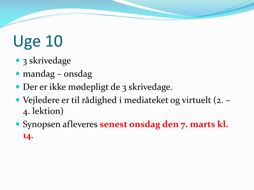 Uge 10 • 3 skrivedage • mandag – onsdag • Der er ikke mødepligt de 3 skrivedage. • Vejledere er til rådighed i mediateket og virtuelt (2. – 4. lektion) • Synopsen afleveres senest onsdag den 7. marts kl. 14.