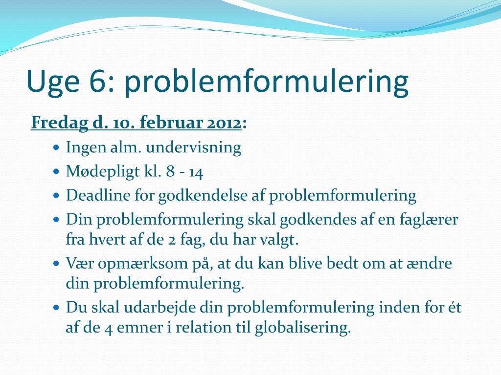 Uge 6: problemformulering Fredag d. 10. februar 2012: • Ingen alm. undervisning • Mødepligt kl. 8 - 14 • Deadline for godkendelse af problemformulering • Din problemformulering skal godkendes af en faglærer fra hvert af de 2 fag, du har valgt. • Vær opmærksom på, at du kan blive bedt om at ændre din problemformulering. • Du skal udarbejde din problemformulering inden for ét af de 4 emner i relation til globalisering.