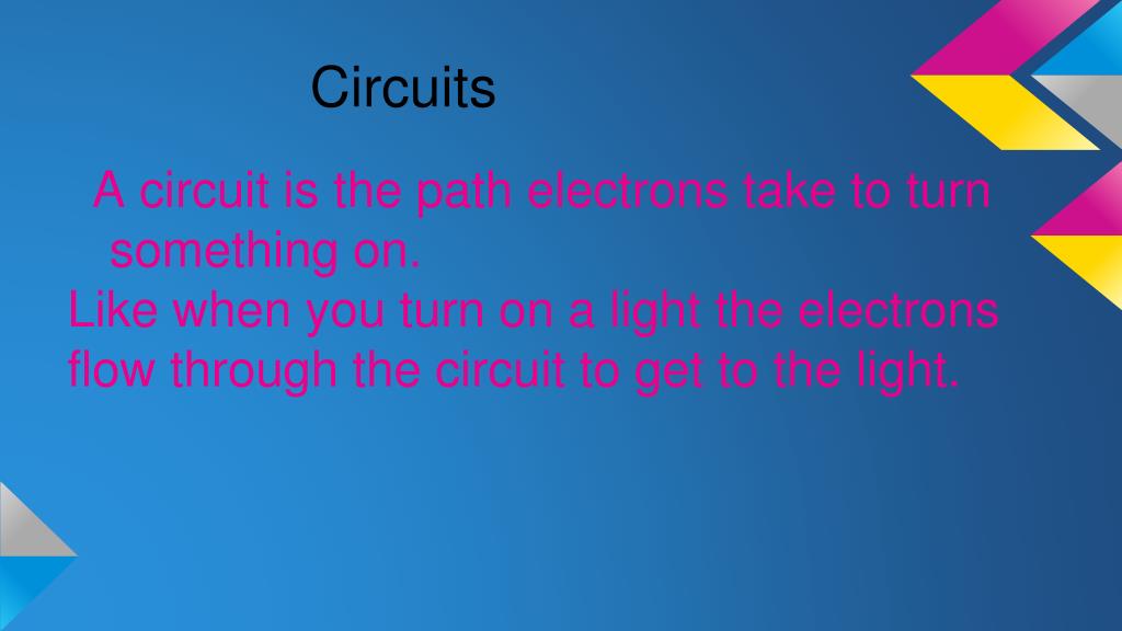 Circuits A circuit is the path electrons take to turn something on. Like when you turn on a light the electrons flow through the circuit to get to the light.