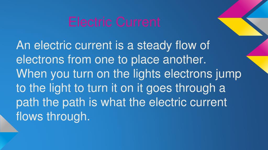 Electric Current An electric current is a steady flow of electrons from one to place another. When you turn on the lights electrons jump to the light to turn it on it goes through a path the path is what the electric current flows through.