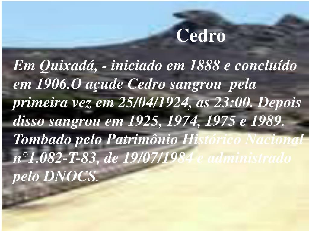 Cedro Em Quixadá, - iniciado em 1888 e concluído em 1906.O açude Cedro sangrou pela primeira vez em 25/04/1924, as 23:00. Depois disso sangrou em 1925, 1974, 1975 e 1989. Tombado pelo Patrimônio Histórico Nacional n°1.082-T-83, de 19/07/1984 e administrado pelo DNOCS.