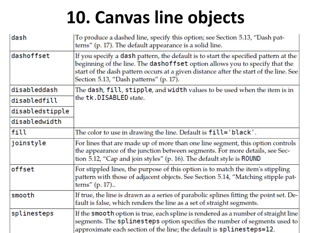 10. Canvas line objects • In general, a line can consist of any number of segments connected end to end, and each segment can • be straight or curved. To create a canvas line object on a canvas C, use: • id = C.create_line(x0, y0, x1, y1, ..., xn, yn, option, ...) • The line goes through the series of points (x0, y0), (x1, y1), … (xn, yn).
