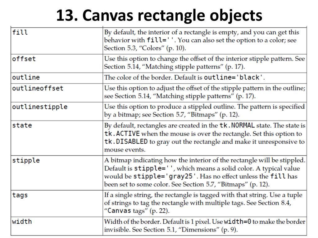 13. Canvasrectangleobjects • Each rectangle is specified as two points: (x0, y0) is the top left corner, and (x1, y1) is the location of • the pixel just outside of the bottom right corner. • For example, the rectangle specified by top left corner (100,100) and bottom right corner (102,102) is a • square two pixels by two pixels, including pixel (101,101) but not including (102,102). • Rectangles are drawn in two parts: • • The outline lies inside the rectangle on its top and left sides, but outside the rectangle on its bottom • and right side. The default appearance is a one-pixel-wide black border. • For example, consider a rectangle with top left corner (10,10) and bottom right corner (11,11). If you • request no border (width=0) and green fill (fill='green'), you will get one green pixel at (10,10). • However, if you request the same options with a black border (width=1), you will get four black • pixels at (10,10), (10,11), (11,10), and (11,11). • • The fill is the area inside the outline. Its default appearance is transparent. • To create a rectangle object on canvas C: • id = C.create_rectangle(x0, y0, x1, y1, option, ...) • This constructor returns the object ID of the rectangle on that canvas.