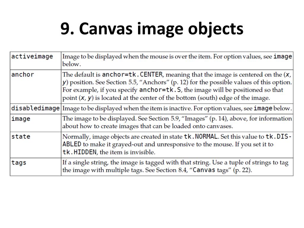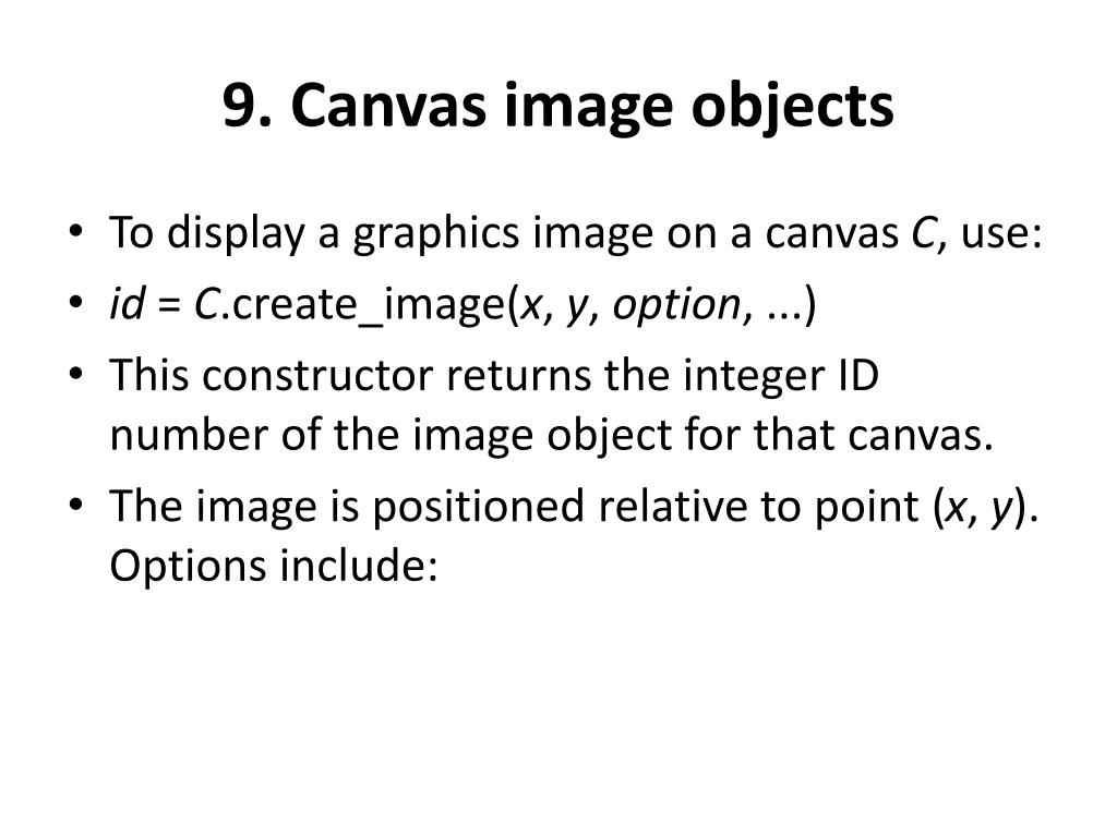 9. Canvasimageobjects • To display a graphics image on a canvas C, use: • id = C.create_image(x, y, option, ...) • This constructor returns the integer ID number of the image object for that canvas. • The image is positioned relative to point (x, y). Options include: