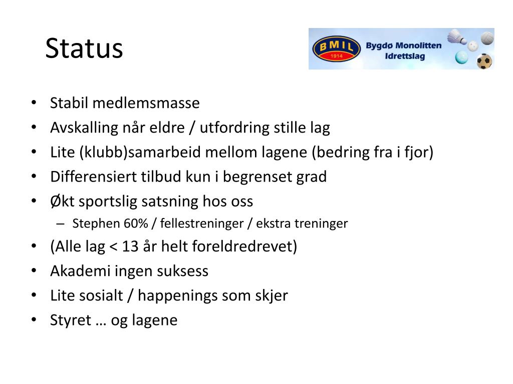 Status • Stabil medlemsmasse • Avskalling når eldre / utfordring stille lag • Lite (klubb)samarbeid mellom lagene (bedring fra i fjor) • Differensiert tilbud kun i begrenset grad • Økt sportslig satsning hos oss • Stephen 60% / fellestreninger / ekstra treninger • (Alle lag < 13 år helt foreldredrevet) • Akademi ingen suksess • Lite sosialt / happenings som skjer • Styret … og lagene