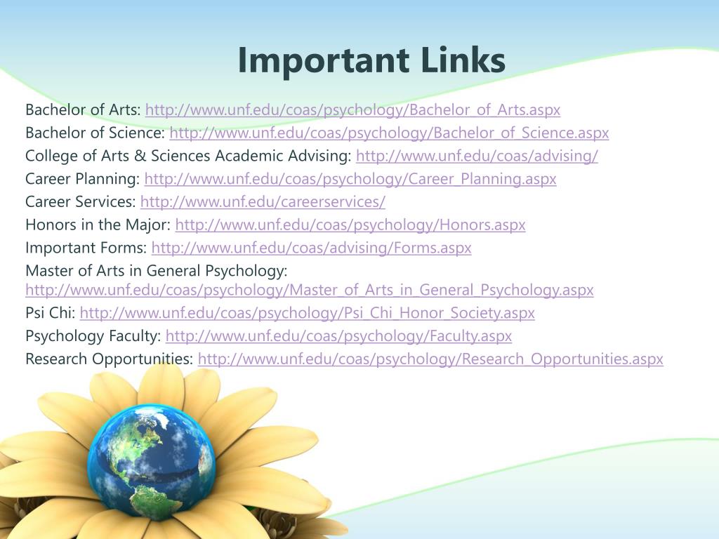 Important Links • Bachelor of Arts: http://www.unf.edu/coas/psychology/Bachelor_of_Arts.aspx • Bachelor of Science: http://www.unf.edu/coas/psychology/Bachelor_of_Science.aspx • College of Arts & Sciences Academic Advising: http://www.unf.edu/coas/advising/ • Career Planning: http://www.unf.edu/coas/psychology/Career_Planning.aspx • Career Services: http://www.unf.edu/careerservices/ • Honors in the Major: http://www.unf.edu/coas/psychology/Honors.aspx • Important Forms: http://www.unf.edu/coas/advising/Forms.aspx • Master of Arts in General Psychology: http://www.unf.edu/coas/psychology/Master_of_Arts_in_General_Psychology.aspx • Psi Chi: http://www.unf.edu/coas/psychology/Psi_Chi_Honor_Society.aspx • Psychology Faculty: http://www.unf.edu/coas/psychology/Faculty.aspx • Research Opportunities: http://www.unf.edu/coas/psychology/Research_Opportunities.aspx