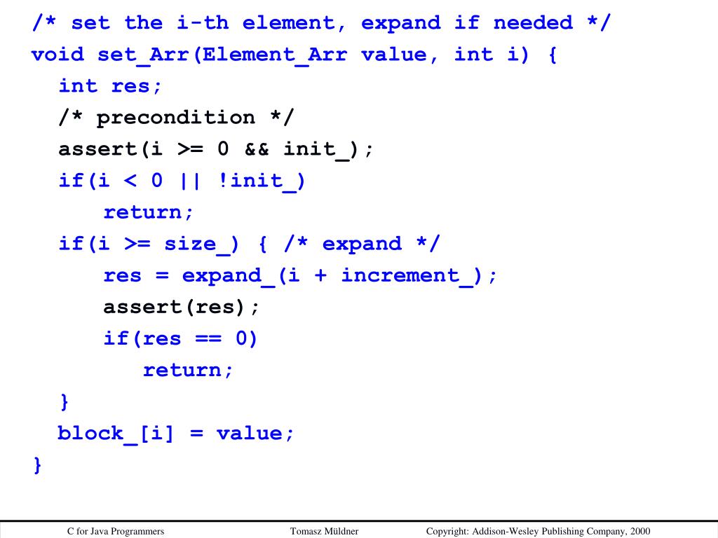 10: Implementation ofArr • /* set the i-th element, expand if needed */ • void set_Arr(Element_Arr value, int i) { • int res; • /* precondition */ • assert(i >= 0 && init_); • if(i < 0 || !init_) • return; • if(i >= size_) { /* expand */ • res = expand_(i + increment_); • assert(res); • if(res == 0) • return; • } • block_[i] = value; • }