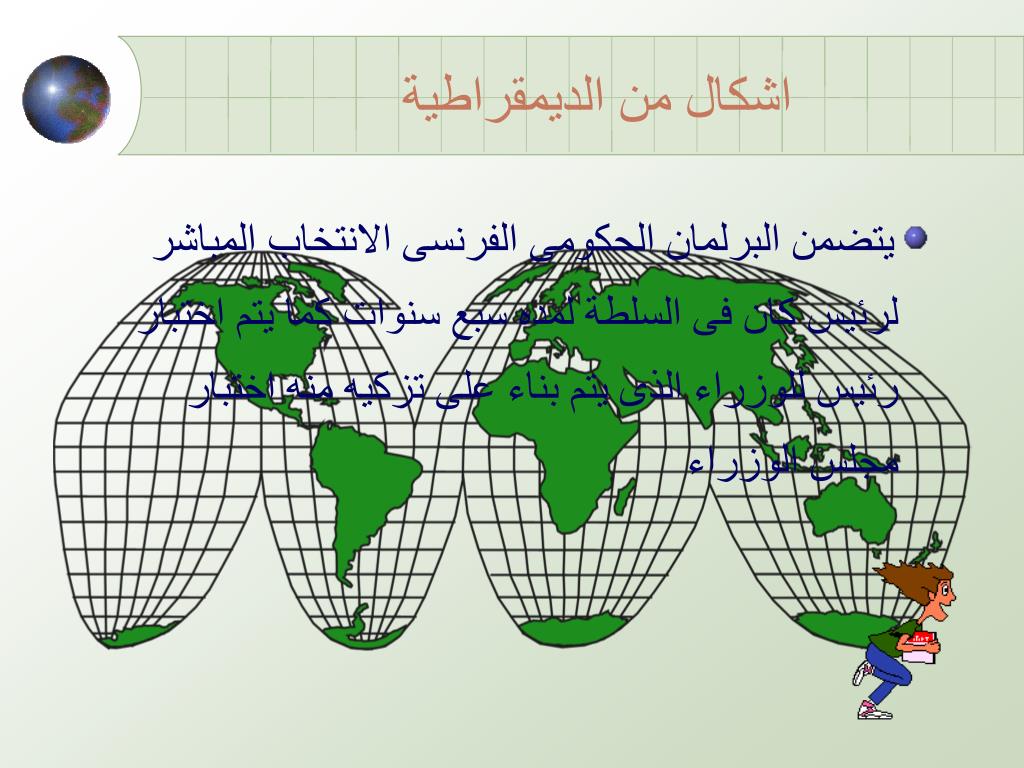 اشكال من الديمقراطية • يتضمن البرلمان الحكومى الفرنسى الانتخاب المباشر لرئيس كان فى السلطة لمده سبع سنوات كما يتم اختبار رئيس للوزراء الذى يتم بناء على تزكيه منه اختبار مجلس الوزراء