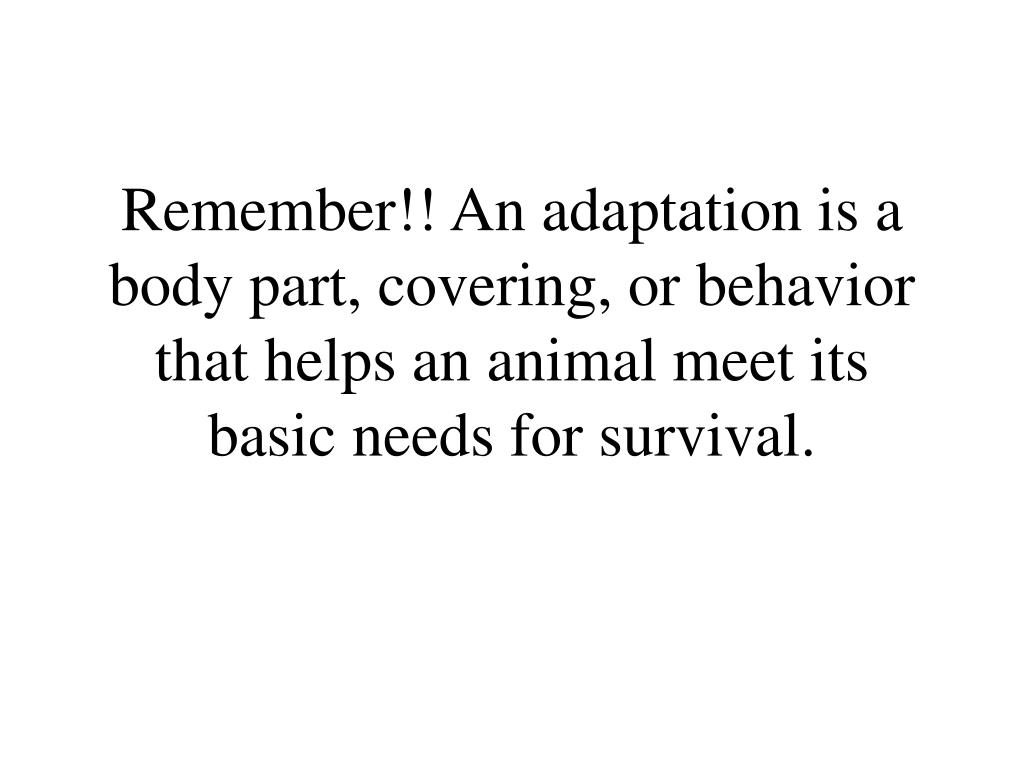 Remember!! An adaptation is a body part, covering, or behavior that helps an animal meet its basic needs for survival.