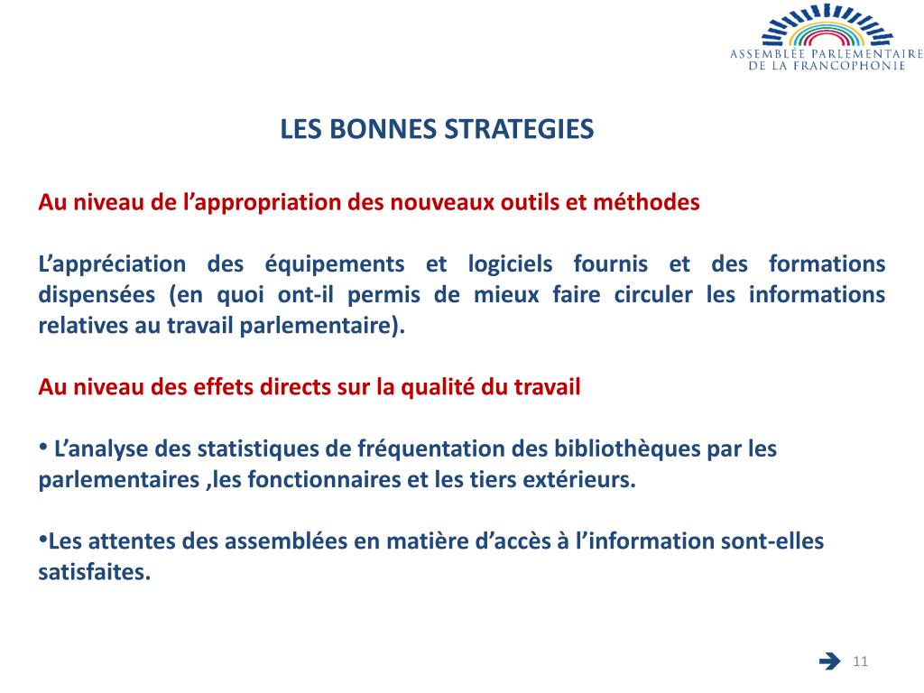 LES BONNES STRATEGIES • Au niveau de l’appropriation des nouveaux outils et méthodes • L’appréciation des équipements et logiciels fournis et des formations dispensées (en quoi ont-il permis de mieux faire circuler les informations relatives au travail parlementaire). • Au niveau des effets directs sur la qualité du travail • L’analyse des statistiques de fréquentation des bibliothèques par les parlementaires ,les fonctionnaires et les tiers extérieurs. • Les attentes des assemblées en matière d’accès à l’information sont-elles satisfaites.