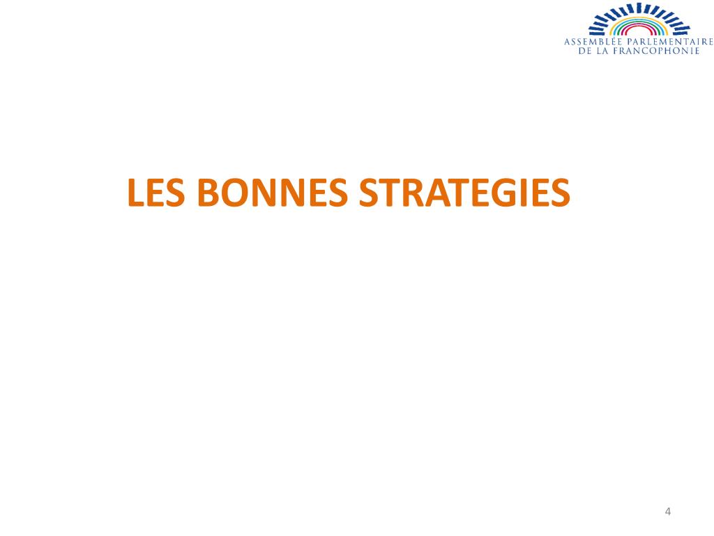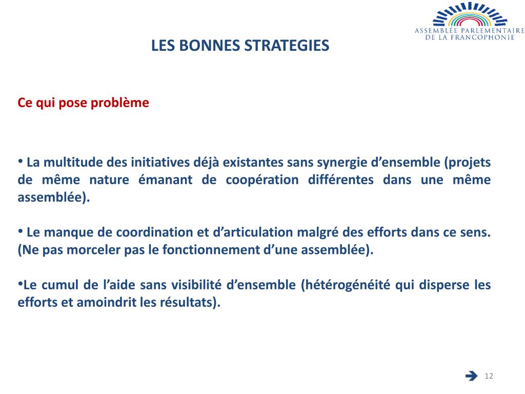 LES BONNES STRATEGIES • Ce qui pose problème • La multitude des initiatives déjà existantes sans synergie d’ensemble (projets de même nature émanant de coopération différentes dans une même assemblée). • Le manque de coordination et d’articulation malgré des efforts dans ce sens. (Ne pas morceler pas le fonctionnement d’une assemblée). • Le cumul de l’aide sans visibilité d’ensemble (hétérogénéité qui disperse les efforts et amoindrit les résultats).