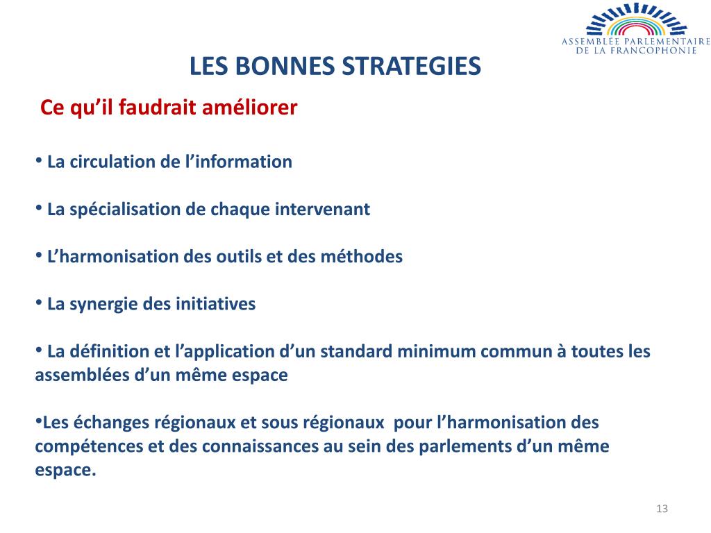 LES BONNES STRATEGIES • Ce qu’il faudrait améliorer • La circulation de l’information • La spécialisation de chaque intervenant • L’harmonisation des outils et des méthodes • La synergie des initiatives • La définition et l’application d’un standard minimum commun à toutes les assemblées d’un même espace • Les échanges régionaux et sous régionaux pour l’harmonisation des compétences et des connaissances au sein des parlements d’un même espace.