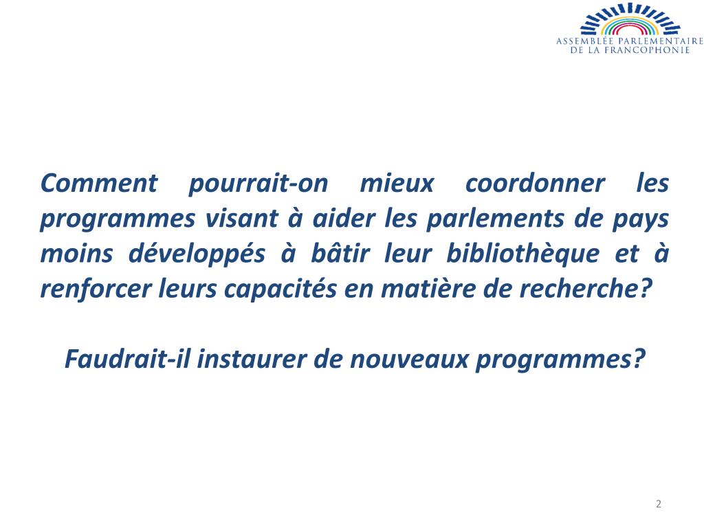 Comment pourrait-on mieux coordonner les programmes visant à aider les parlements de pays moins développés à bâtir leur bibliothèque et à renforcer leurs capacités en matière de recherche? Faudrait-il instaurer de nouveaux programmes?