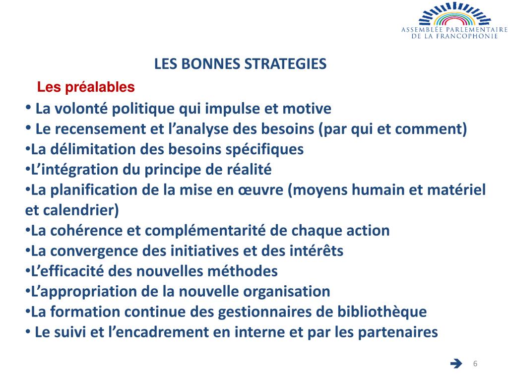 LES BONNES STRATEGIES Les préalables • La volonté politique qui impulse et motive • Le recensement et l’analyse des besoins (par qui et comment) • La délimitation des besoins spécifiques • L’intégration du principe de réalité • La planification de la mise en œuvre (moyens humain et matériel et calendrier) • La cohérence et complémentarité de chaque action • La convergence des initiatives et des intérêts • L’efficacité des nouvelles méthodes • L’appropriation de la nouvelle organisation • La formation continue des gestionnaires de bibliothèque • Le suivi et l’encadrement en interne et par les partenaires