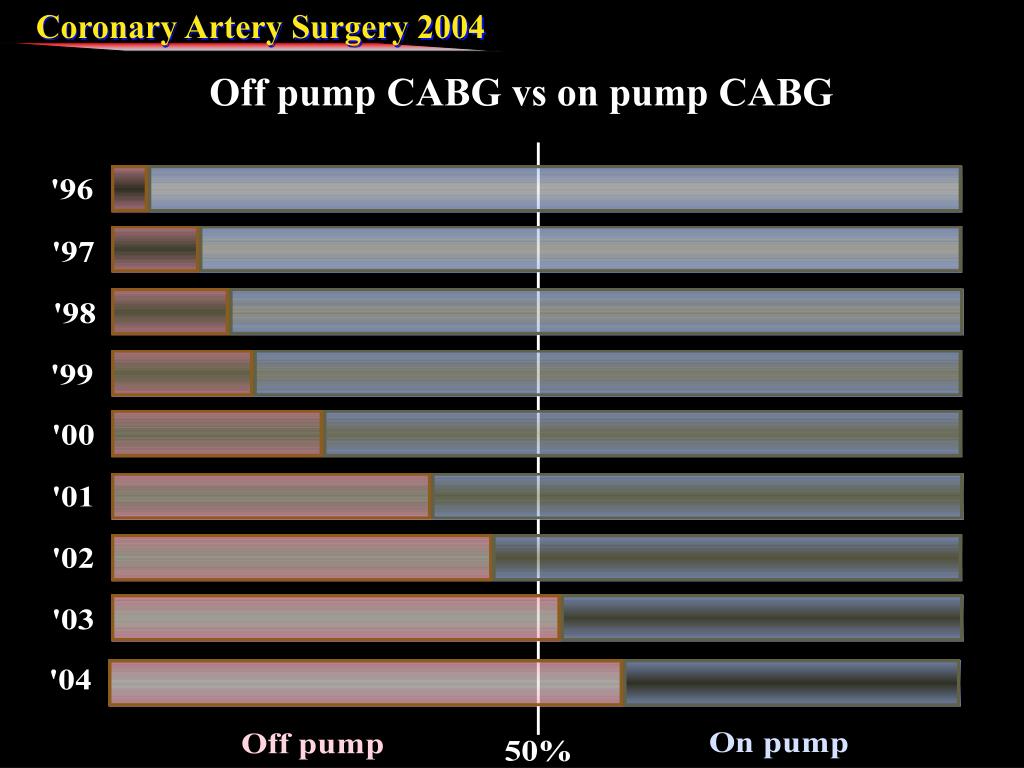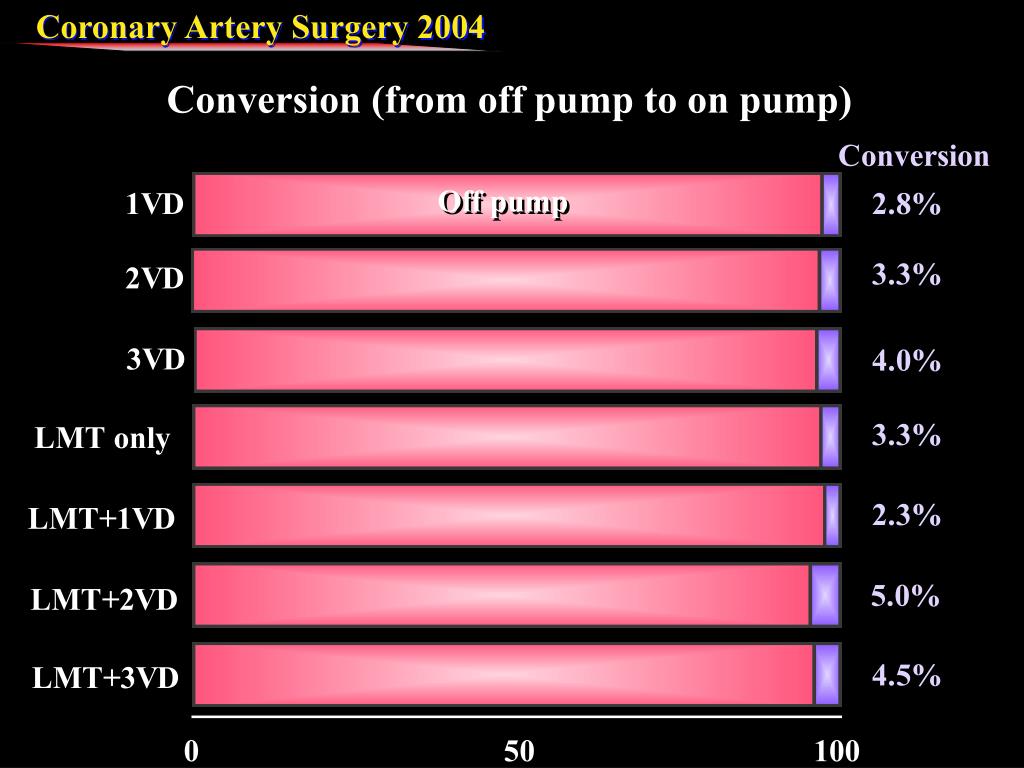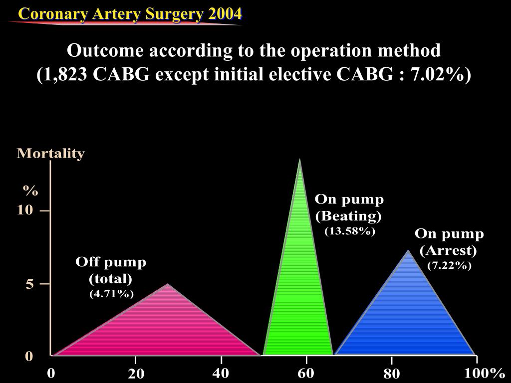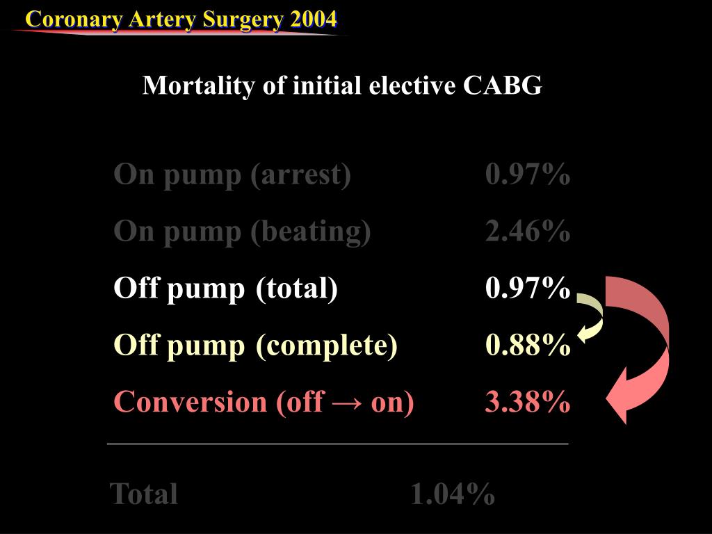 On pump (arrest) 0.97% On pump (beating) 2.46% Off pump (total) 0.97% Off pump (complete) 0.88% Conversion (off → on) 3.38% Total 1.04% Mortality of initial elective CABG On pump (arrest) 0.97% On pump (beating) 2.46% Off pump 0.97% Total 1.04%