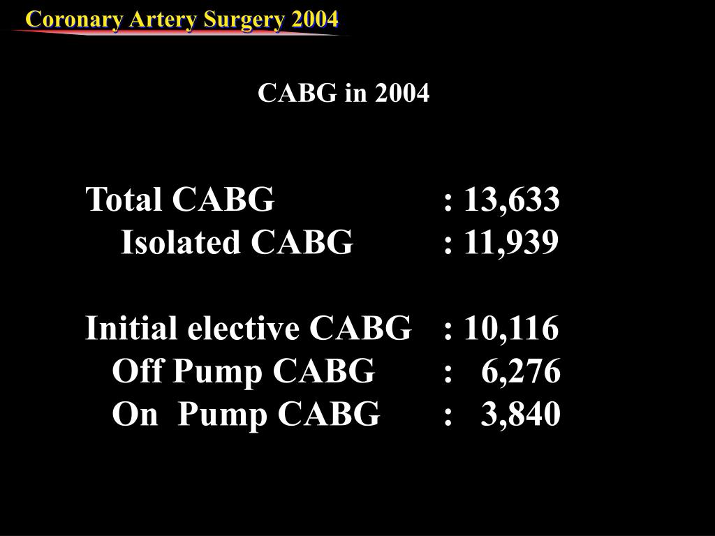 CABG in 2004 Total CABG : 13,633 Isolated CABG : 11,939 Initial elective CABG : 10,116 Off Pump CABG : 6,276 On Pump CABG : 3,840