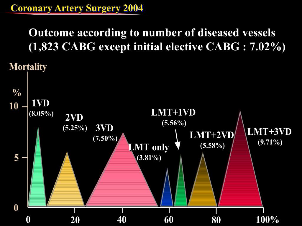 CABG(-) Mortality 4.9% Total (death) 41(2) 161(2) CABG(+) Mortality 1.2% Left ventricular aneurysm Mortality 2.0%