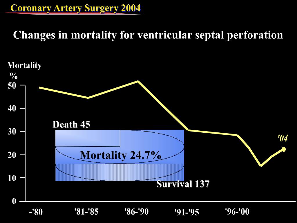 Death 45 Mortality 24.7% Survival 137 Changes in mortality for ventricular septal perforation