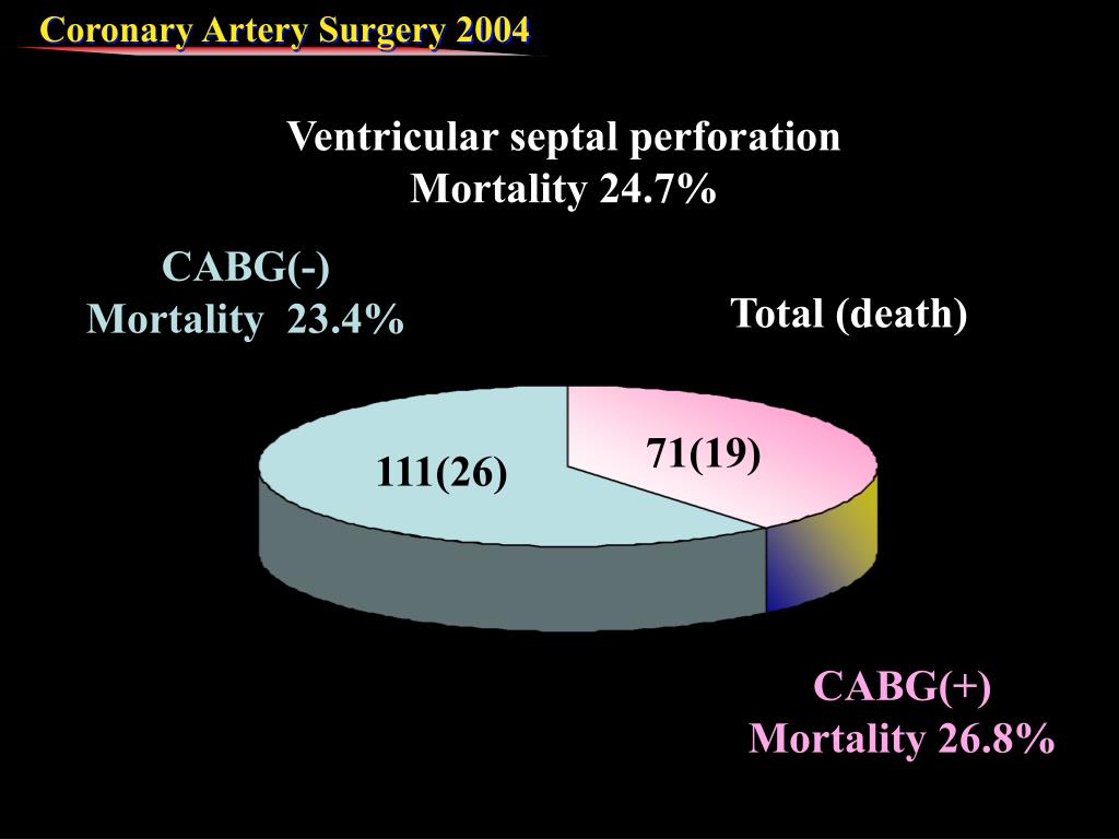CABG(-) Mortality 23.4% Total (death) 71(19) 111(26) CABG(+) Mortality 26.8% Ventricular septal perforation Mortality 24.7%