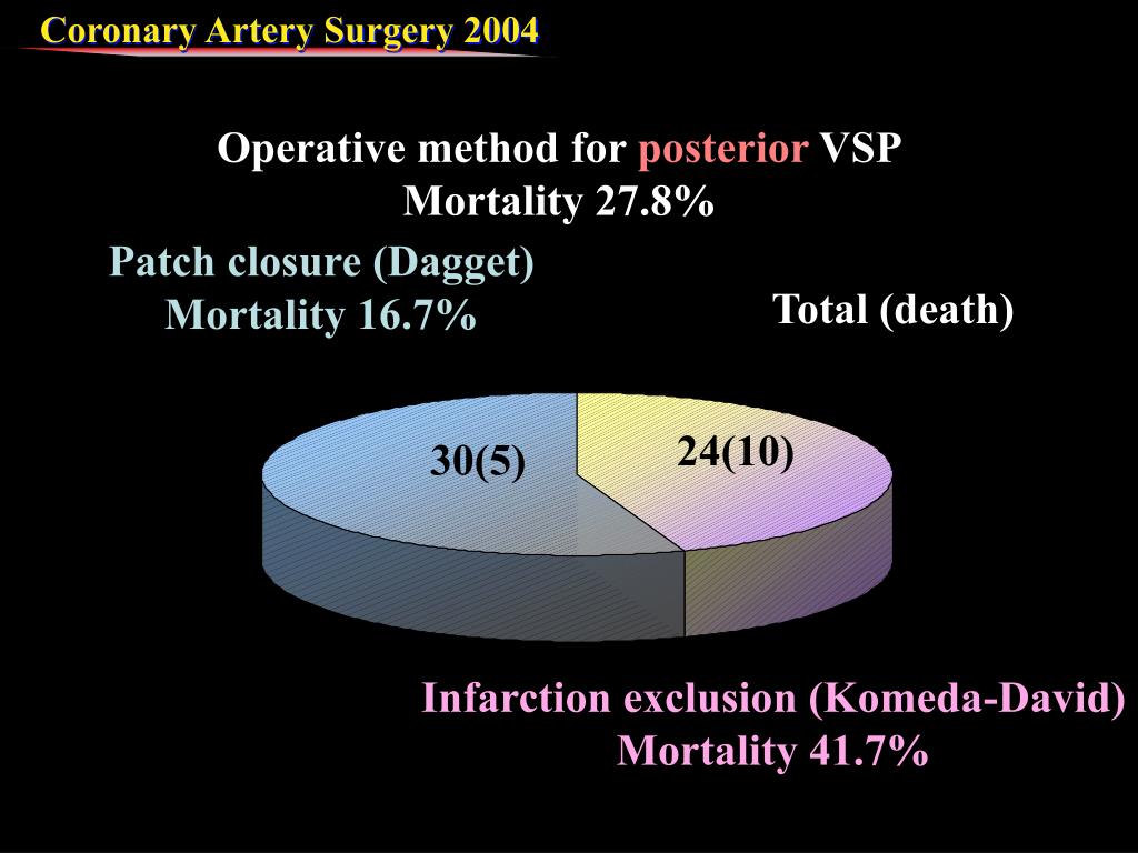 Patch closure (Dagget) Mortality 16.7% Total (death) 24(10) 30(5) Infarction exclusion (Komeda-David) Mortality 41.7% Operative method for posterior VSP Mortality 27.8%